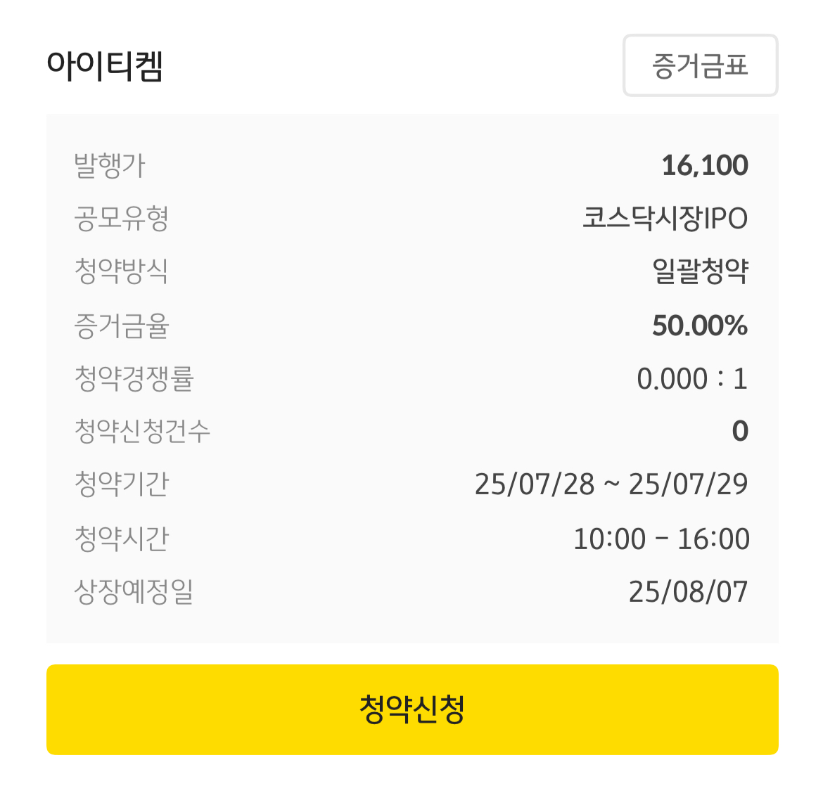 | 아이티켐 공모주 균등 결과 0주.. 하하하 (5) | 2025.07.30 |